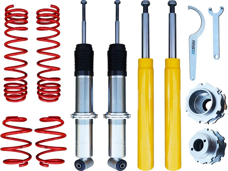 W skład zestawu wchodzą 2 amortyzatory gwintowane, 4 sprężyny sportowe, amortyzatory tylne, tuleje regulacyjne tylne, klucz do regulacji wysokości oraz certyfikat TUV